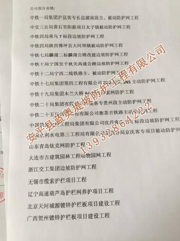 全部各地的客戶(hù)朋友們打進(jìn)電話會(huì)咨詢(xún)一下邊坡防護(hù)網(wǎng)產(chǎn)品的問(wèn)題,產(chǎn)品了解清楚后有的朋友會(huì)考察一下公司情況。這樣的客戶(hù)朋友我們是非常尊重的,了解供貨方公司實(shí)力這是最自己負(fù)責(zé)對(duì)工程負(fù)責(zé)。因此我們會(huì)提供我公司的相關(guān)資質(zhì)、產(chǎn)品質(zhì)量檢測(cè)報(bào)告、進(jìn)場(chǎng)施工證明等。其實(shí)可以通過(guò)公司的工程業(yè)績(jī)(承接的工程項(xiàng)目)來(lái)證明公司實(shí)力。有些客戶(hù)會(huì)來(lái)我公司考察,為了客戶(hù)更方便的了解我們之前做過(guò)的一些項(xiàng)目,我們將最近3年施工過(guò)的邊坡防護(hù)網(wǎng)工程業(yè)績(jī)做了一下統(tǒng)計(jì),并打印出來(lái)。